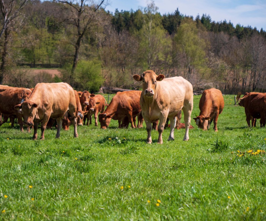 Ungefähr hundertfünzig Limousinrinder leben bei uns auf dem Hof. Darunter achtzig Kühe, zwei Bullen und die Nachzucht. Die Rasse Limousin gilt weltweit als eine der besten Fleischrinderrassen die es gibt. Besonders bekannt und beliebt ist die Rasse wegen seinem zarten, mageren und feinfasrigen Fleisches, weshalb es sich sehr gut zum Verzehr eignet. Unsere Rinderherde lebt fast das ganze Jahr draußen und darf auf mehreren großen Weiden grasen und ihre Kälber großziehen.